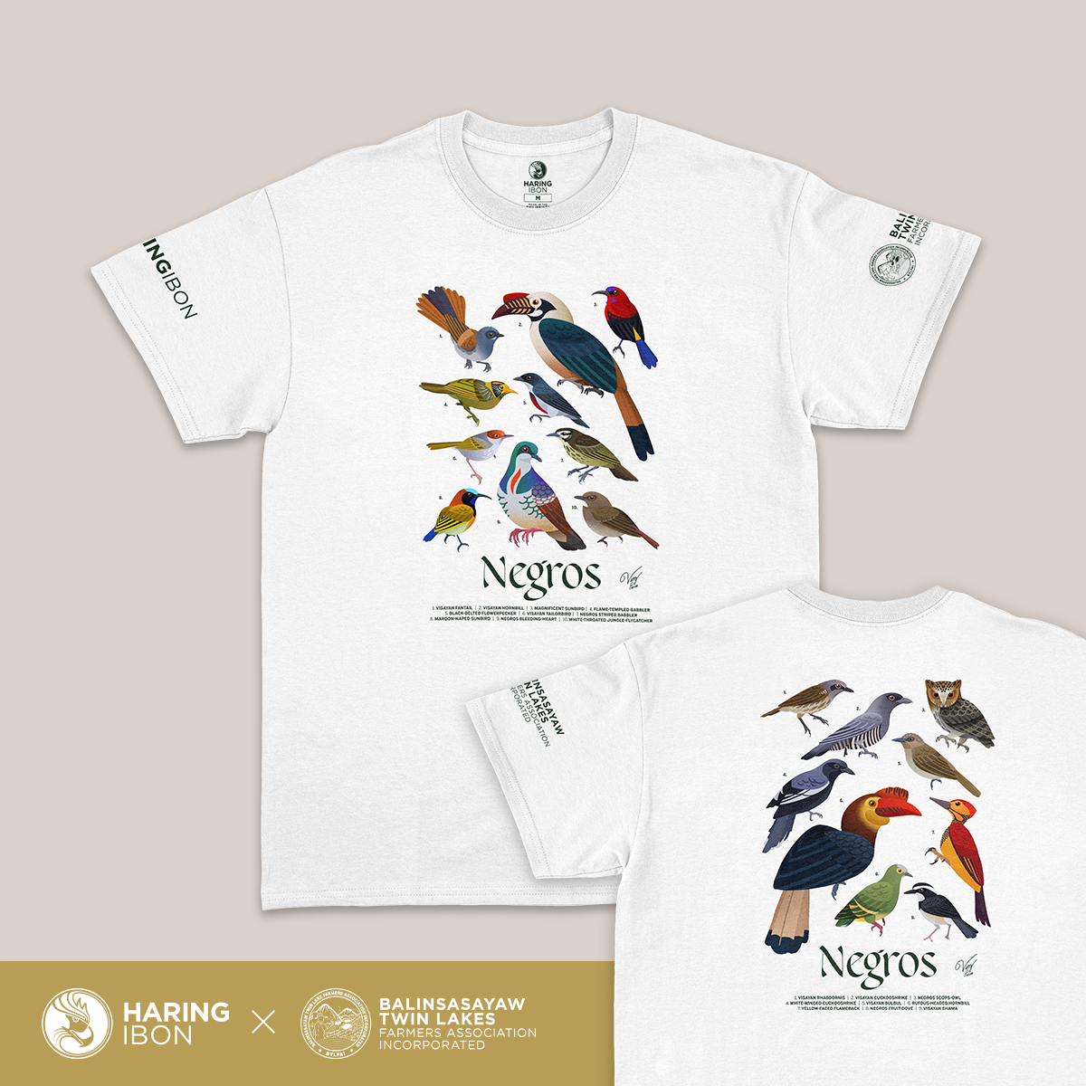 The "Birds of Negros Island" graphic tee, illustrated by Vinz Pascua, was made featuring all the 19 Western Visayas endemic bird species found in the island of Negros, as recognized by the 2025 AviList Taxonomic Checklist.