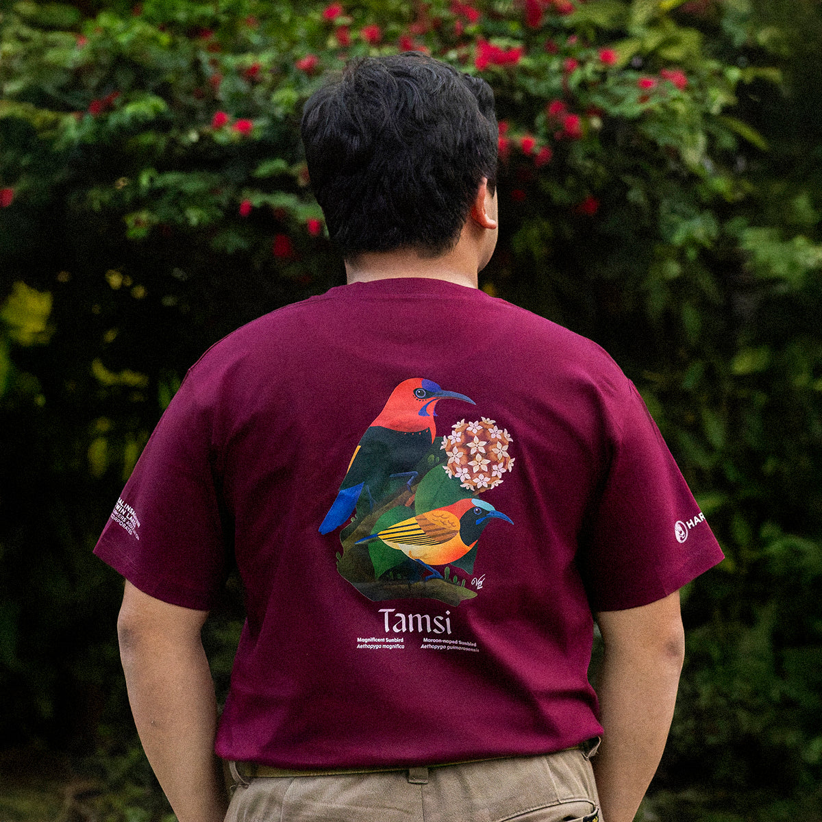 This maroon graphic tee features the Tariktik (Visayan Hornbill, Penelopides panini) and two species of Tamsi (Magnificent Sunbird, Aethopyga magnifica; Maroon-naped Sunbird, Aethopyga guimarasensis). Instead of just featuring two bird species, this design features three, with the back design sharing the same local name. All three of these bird species are endemic to the Western Visayas biogeographic region and are regularly seen in Balinsasayao Twin Lakes Natural Park.
